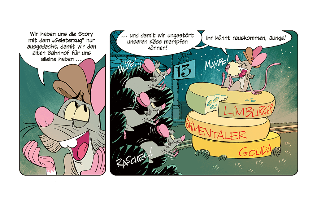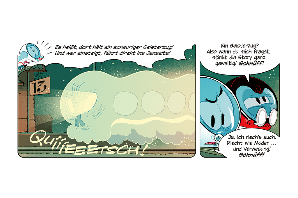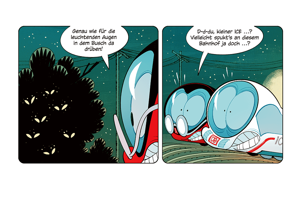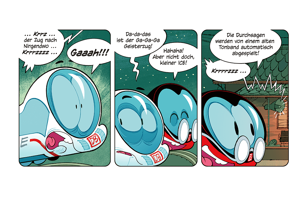 Der kleine ICE trifft seinen Freund Robbi Regio an einem alten Bahnhof. Dort soll ein Geisterzug spuken! Die beiden haben zuerst große Angst, entdecken aber bald, wer wirklich hinter dem Spuk steckt – ein paar schlaue Mäuse, die heimlich Käse essen wollten. Am Ende lachen alle – der Spuk war nur eine erfundene Geschichte!