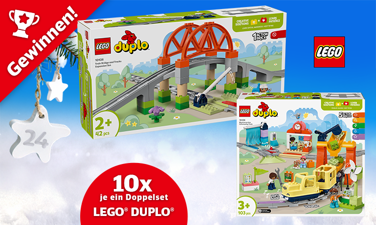 Mach mit und gewinne eines von zehn Eisenbahn-Doppelsets – vielleicht fährt bald ein LEGO® DUPLO® Zug durch dein Kinderzimmer. Einfach Formular ausfüllen und Daumen drücken!