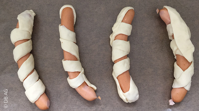 • In der Küche: Teig ausrollen, in daumendicke Streifen schneiden und damit die Würstchen wild umwickeln.