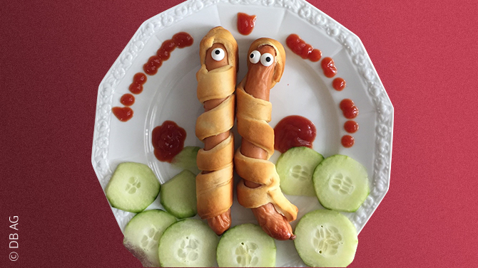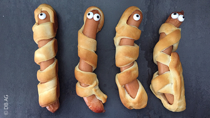 • Im Supermarkt Blätter- oder Pizzateig, Würstchen, Zuckeraugen und Ketchup kaufen.