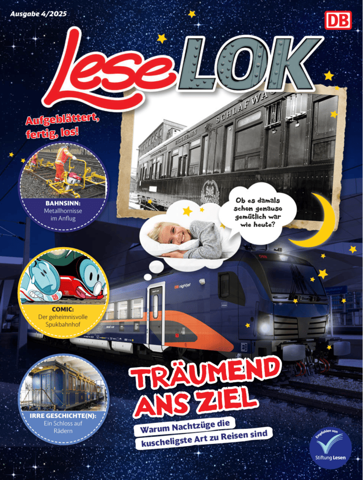 Schlafen und dabei reisen? Nachtzüge machen’s möglich! In dieser LeseLOK erfährst du, warum das die kuscheligste Art ist, unterwegs zu sein. Außerdem warten spannende Geschichten und Abenteuer auf dich: Der kleine ICE bibbert am geheimnisvollen Spukbahnhof, die „Metallhornisse“ bringt Funken auf die Schienen, und mit der Brockenbahn fährst du zum Hexengipfel. Natürlich gibt’s auch Rätsel zum Knobeln, Witze von Günni, kreative Bastelideen und leckere Gruselrezepte. Und zum Schluss jede Menge Extras für junge Bahn-Fans. Klingt nach einer Fahrt voller Spaß und Überraschungen – steig ein! Empfohlen für selbstlesende Kinder ab 7 Jahren