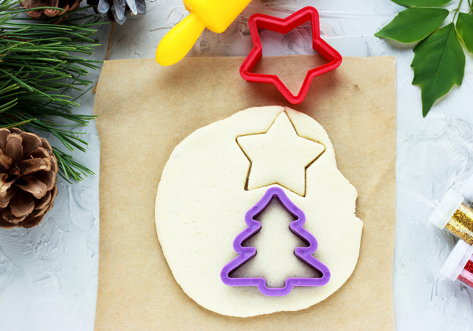 Der Teig ist dünn ausgerollt. Mit den Ausstechern werden ein Stern und ein Tannenbaum ausgestochen.